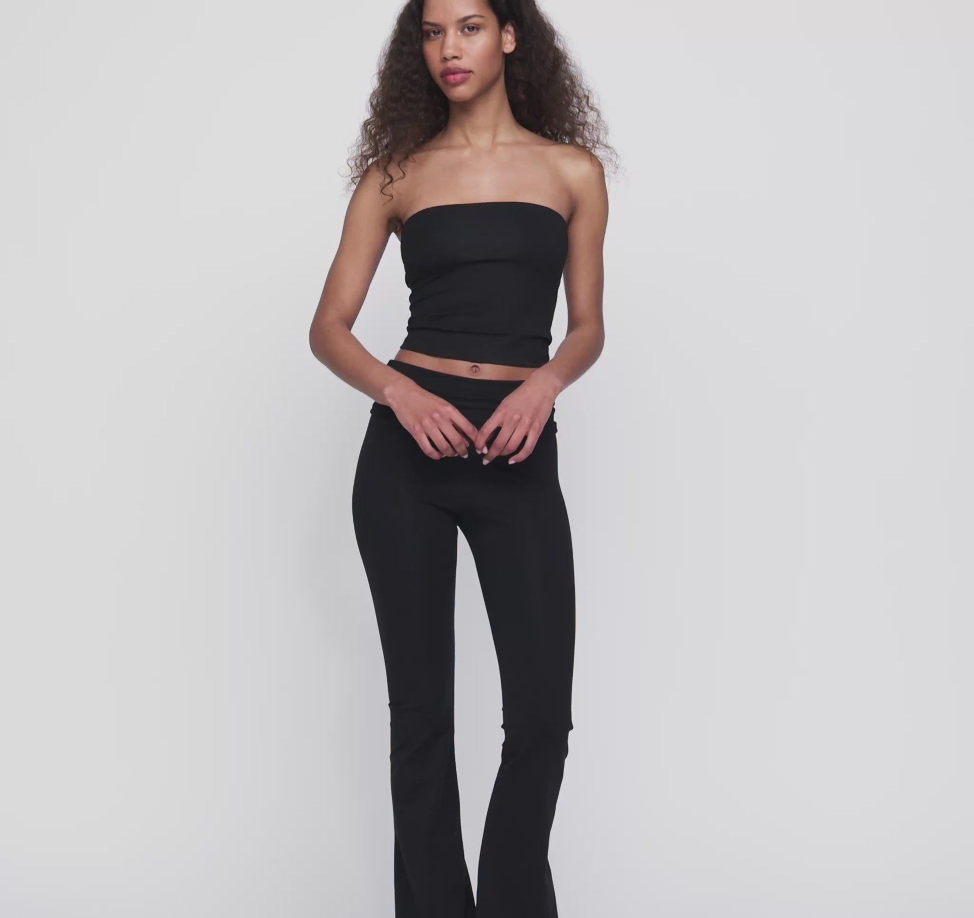 Mid-rise, foldover waistband, flared leg. Comfortable enough to wear all day, flattering enough to want to.