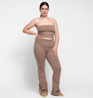 Mid-rise, foldover waistband, flared leg. Comfortable enough to wear all day, flattering enough to want to.
